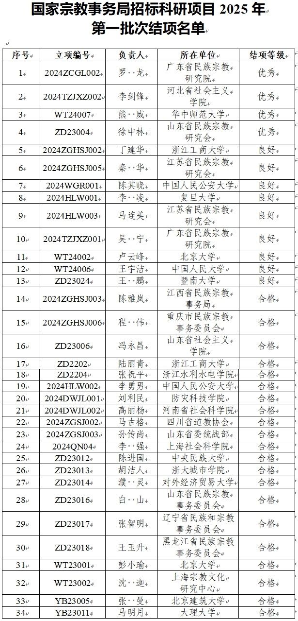 经专家评审,现公布国家宗教事务局招标科研项目2025年第一批次结项名单。